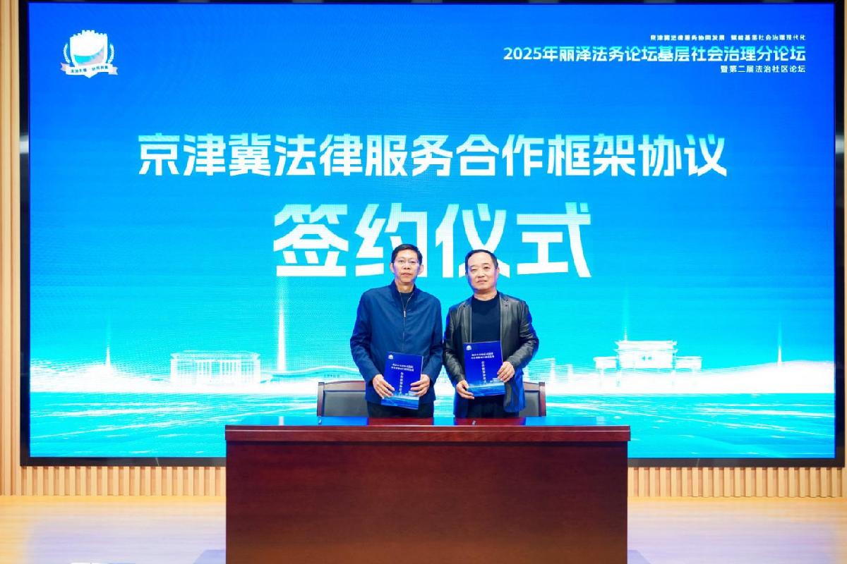 论坛在多项签约与揭牌环节取得实质性进展。“京津冀法律服务合作框架协议”由北京市丰台区、河北省张家口市、沧州市司法局代表共同签约,标志着三地法律服务协同进入机制化新阶段;“京津冀法律服务基层社会协同治理合作框架协议”由河北雄县政法委与天津红桥区邵公庄街道、北京丰台区新村街道共同签署,推动法律服务进一步向社区延伸。