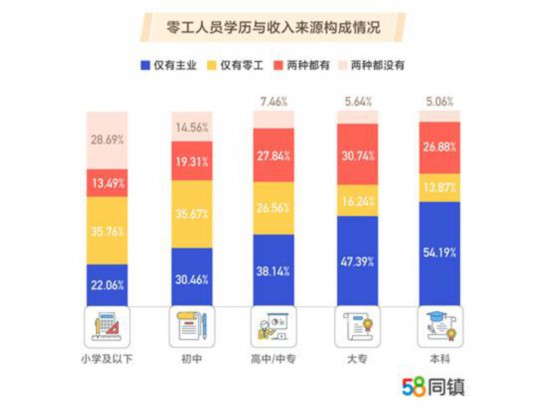 58同镇《2019中国县域零工经济调查报告》还反映出,从学历与收入来源构成来看,无收入人群小学及以下学历比例达到了28.69%,这部分人群职业以无业和务农为主。由于受教育程度不高,几乎无合适工作岗位。随着学历的增加,仅有主业和两者都有的人数比例上升,仅有零工和两者都没有的人数比例下降,可见随着学历提高,稳定职业的选择权增加,就业越稳定,同时也有更多机会通过副业增加收入,主副业结合的现象越突出。县域的高收入者为主副业兼顾的人群,这部分人群的主业与零工收入占比约为2:1,可见“斜杠青年”是县域高收入群体中的佼佼者。